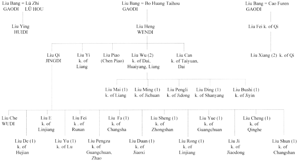 Gaodi’s consorts included: Lü Zhi (Lü Hou), mother of Liu Ying and Lu Yuan Gongzhu; Cao, mother of Liu Fei; Qi Yi, mother of Liu Ruyi; Bo Huang Taihou, mother of Liu Heng.