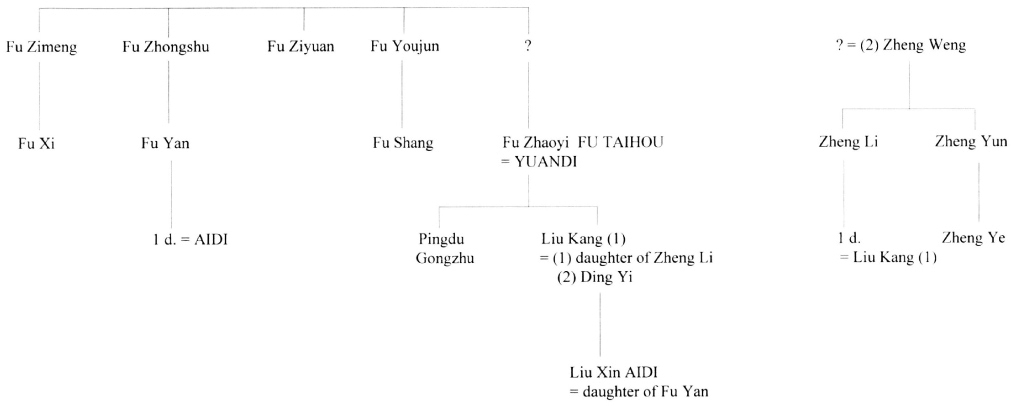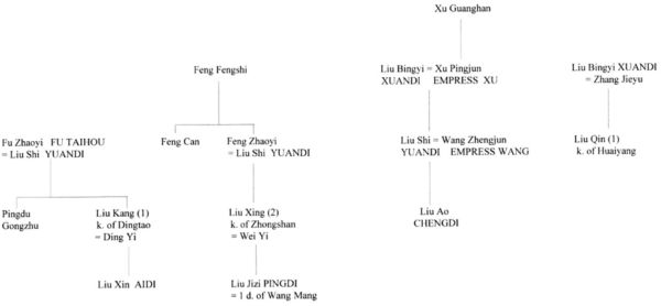 Yuandi’s consorts included:Wang Zhengjun (Empress Wang), mother of Chengdi; Feng Zhaoyi, grandmother of Pingdi; Fu Zhaoyi, grandmother of Aidi.