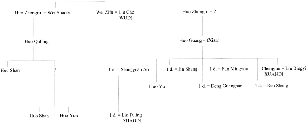Of Huo Guang’s sons-in-law, Jin Shang was the son of Jin Midi; Shangguan An was the son of Shangguan Jie (2).